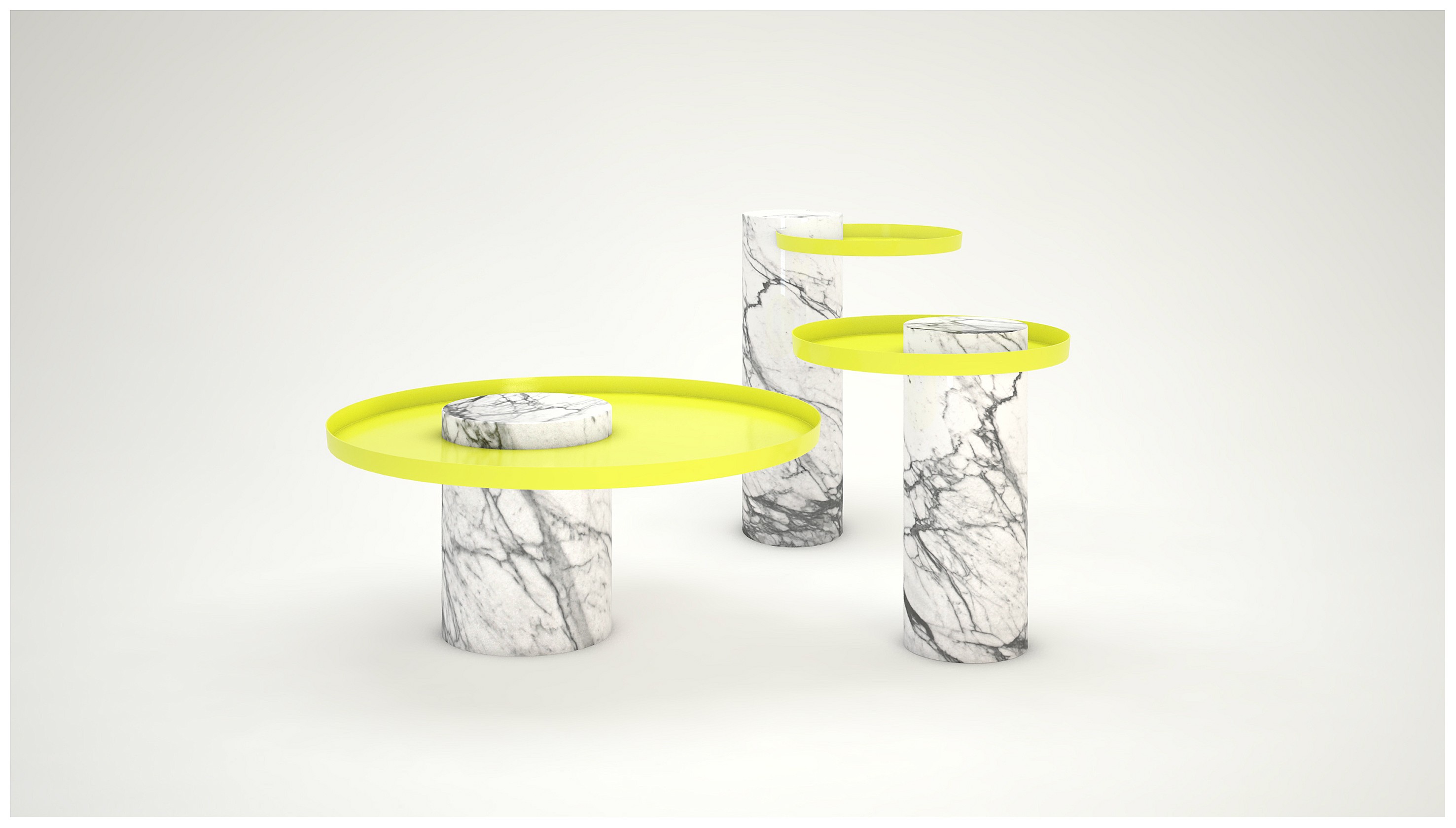 Salute is a family of tables mixing marble and metal for a high visual impact. As an occasional table, Salute is the perfect companion to your iconic armchair or next to a comfy sofa, with its clean lines and yet strong personality and impact. As a combination of tables, it is a sculptural coffee table that you can customize and adapt both in dimensions and colors.