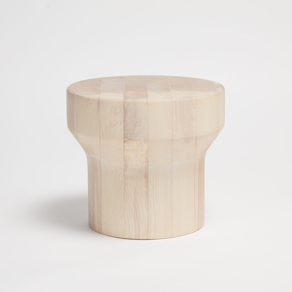 Turned from a solid block of laminated ash and finished with a white oil and wax, each side table will look different and unique, and they are liable to split in places due to thickness of the block, but this is intentional.